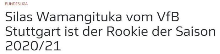 JRS直播网讯北京时间5月18日,德甲联赛官方宣布,斯图加特边锋瓦曼吉图卡当选赛季最佳新秀。