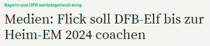 据德媒报道,德国足协希望弗里克能率领德国队参加2022年卡塔尔世界杯和2024年在德国本土举办的欧洲杯。之前有消息称德国足协最快在欧洲杯之前就能与弗里克完成签约,但弗里克最早在今年欧洲杯之后才会接手国家队的工作。