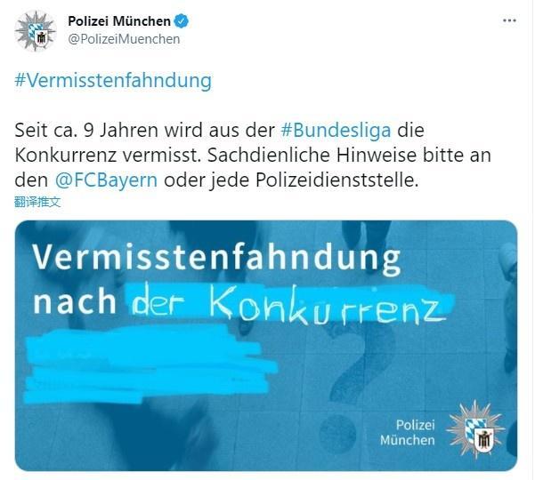 慕尼黑警方在社交媒体上晒出了一张特别的“寻人启事”,上面写道:拜仁的竞争对手九年前从德甲失踪,有更多相关的消息,请联系拜仁俱乐部或者慕尼黑警方。“