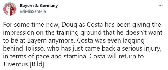 《图片报》表示,道格拉斯-科斯塔在训练场上给人的印象是他不想待在拜仁了,本来以速度见长的他,在速度和耐力方面甚至落后于重伤刚恢复的托利索。在结束租借后,他将返回尤文图斯。