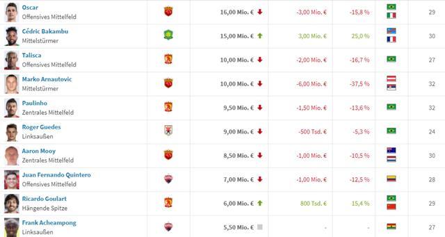 JRS直播网讯 德国转会市场日前更新了部分中超球员的身价,榜单里只有4名球员身价超过1000万欧元。
