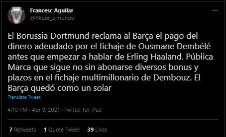 JRS直播网讯北京时间4月10日,根据《世界体育报》主编Francesc Aguilar透露称,多特蒙德向巴萨提出要求,如果想要讨论哈兰德的转会,首先需要付清拖欠多特蒙德的登贝莱的转会费。