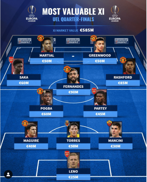 JRS直播网讯,德国转会市场评选出欧联杯八强最贵阵容,曼联6人入选,阿森纳3人入选。