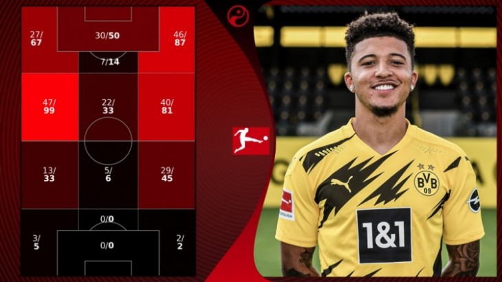 同期桑乔也在德甲完成了最多的过人:尝试过人487次完成271次,每90分钟尝试6次过人完成3.4次。