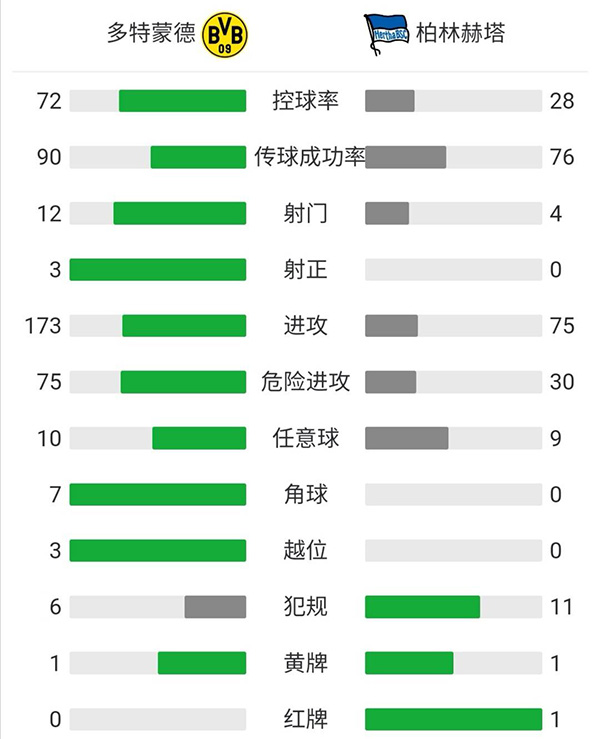第54分钟,多特快速反击,罗伊斯直传,布兰特调整两步后直接拔脚远射,皮球划出一道诡异的弧线飞入球网,多特1-0领先柏林赫塔。