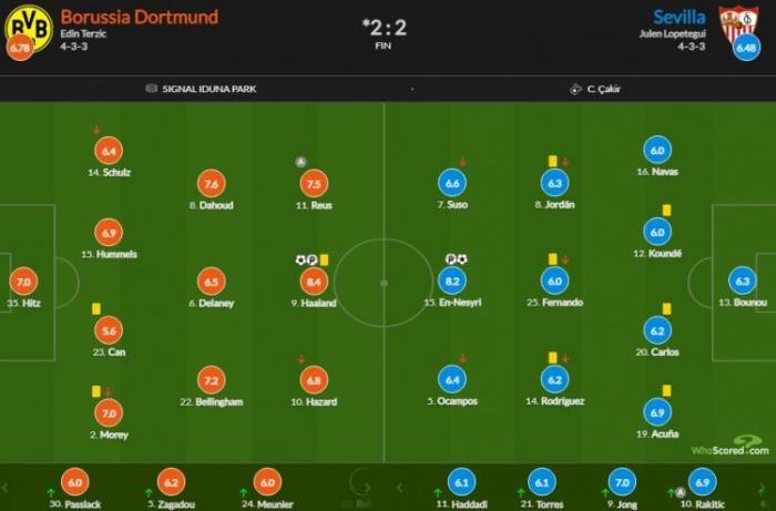 多特首发:希茨7.0、胡梅尔斯6.9、德莱尼6.5、舒尔茨6.4、莫雷7.0、达胡德7.6、贝林厄姆7.2、埃姆雷-詹5.6、罗伊斯7.5、索尔根-阿扎尔6.8、哈兰德8.4