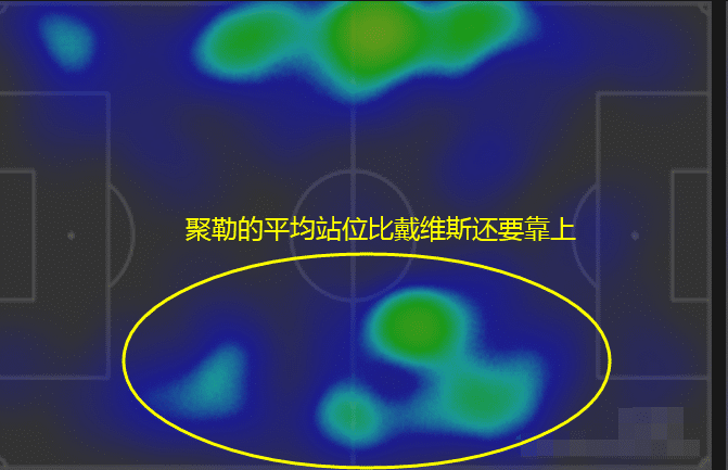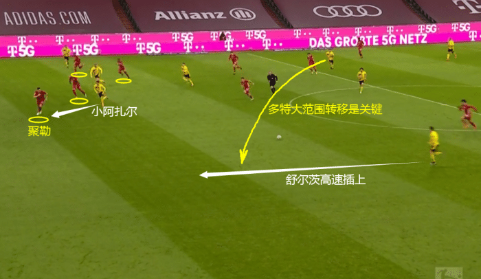 这次攻防中,多特右路进攻受阻后第一时间转移到左路是关键一步。舒尔茨高速插上后交给小阿扎尔,聚勒在内收到中路(类似以往中后卫防区)后拜仁的右边失去屏障,实际上拜仁的整条后防线都往左移了一个身位,可以看到左路的戴维斯实际上是闲置了的。
