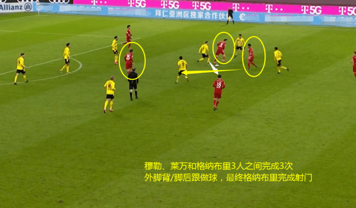 最后阶段拜仁的进攻几乎成了半场乃至大禁区的攻防演练,要知道这可是面对德甲阵容强度第二的球队!看看拜仁众将是如何秀操作的:第77分钟,拜仁左路由格雷茨卡长传发动攻势,随后莱万脚后跟做球给穆勒,接下来穆勒、莱万和格纳布里之间又完成了2次外脚背配合,总计3次花式团队配合打穿多特防线:
