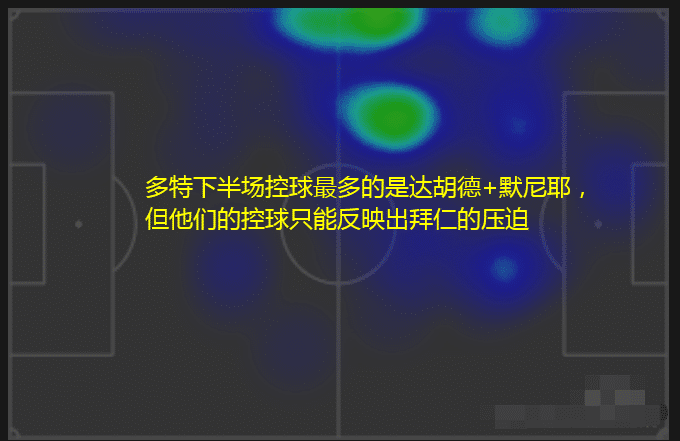 多特上半场的闪电战其实比较消耗,在没有体能优势的情况下如此踢法只要没能打掉拜仁的士气,那么等待他们的只会是崩盘。崩盘的直接体现就是中场的失势,上半场多特中场持球核心达胡德的传球成功率还有70%,到了下半场只剩下可怜的59%;此外多特两边翼也只有33%和39%的传球成功率: