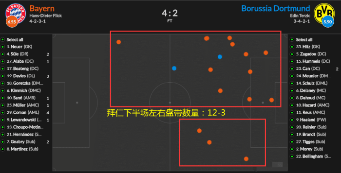 但真正的调整在于整体的战略方向,拜仁主帅弗里克虽然在球场边显得有些焦急,但拜仁全队还是颇为自信,即使两球落后也依然淡定从容地控制节奏。在拜仁打进第一球之前,他们的控球率一度高达62.5%,这还是在多特立足于前场逼抢+积极退防的情况下。下半场拜仁更是将控球优势进一步扩大:触球次数485:265比多特多出83%,控球率68.2%-31.8%更是几乎碾压!
