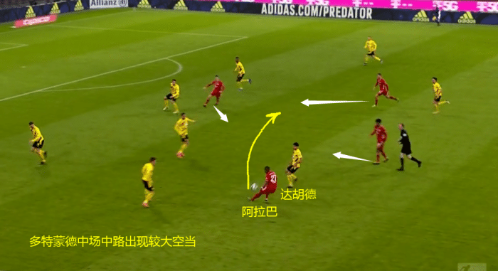 多特蒙德在周中踢了一场德国杯,达胡德、罗伊斯等主力都踢满全场,而拜仁早早淘汰反而为他们赢得了10天的休息时间,就凭这一点多特就没办法一直保持高压防守,因此多特两球领先后的回收几乎就是慢性自杀。比赛踢到60分钟时多特的中场防线就已经开始凌乱,拜仁控球中卫阿拉巴甚至可以压到三区线附近组织进攻:
