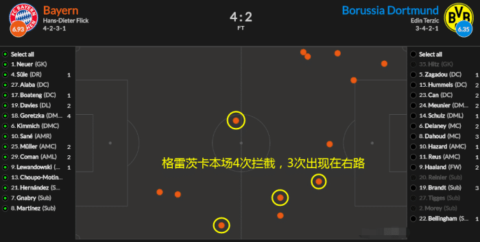 调整之一就是利用中场的格雷茨卡来加强右路的保护。拜仁本身没有绝对的边后腰设置,基米希和格雷茨卡双中场都更接近中路,但此役格雷茨卡加强了右路的协作,他全场4次封堵对手传球,有3次出现在右路,有效缓解了拜仁在此区域的防守压力。