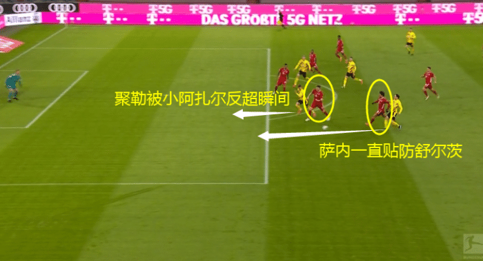 拜仁右路之所以成为多特的重点打击对象,是因为右边锋萨内很少参与深度防守,而聚勒的反应又难以跟上多特超强的反击作战。但显然这一球萨内是完成了自己的防守任务的。因此接下来拜仁要想顶住多特的反击,就必须在整体层面做出调整。