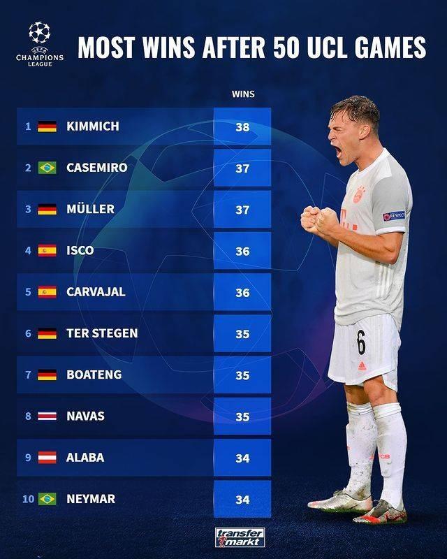 根据德国转会市场统计,基米希在个人的前50场欧冠中取得了38场胜利,胜率76%排在第一。