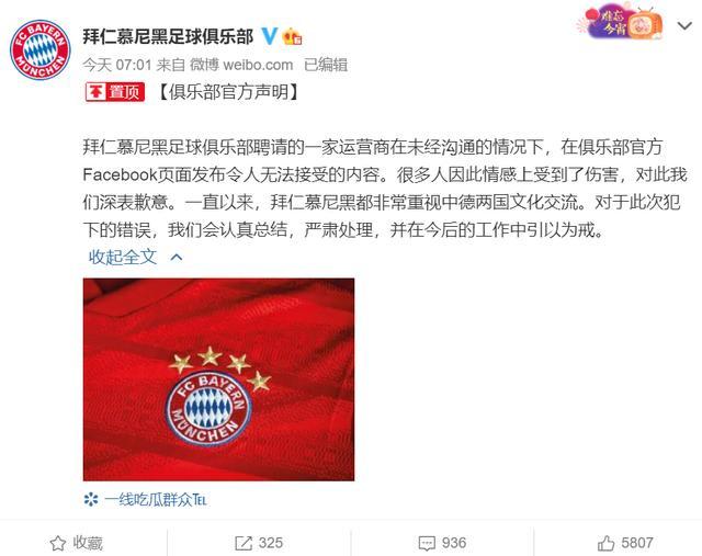 拜仁随后紧急删除这一动态,今天他们在官方微博上发布道歉声明,声明如下:
