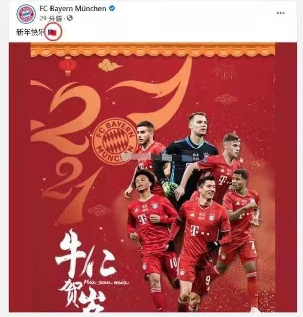 拜仁最近接连放出用多种语言恭贺亚洲国家农历新年快乐的海报,并在文字后面配上相应国旗,而在其中一篇用简体中文写的“新年快乐”后却附上“青天白日满地红”旗。