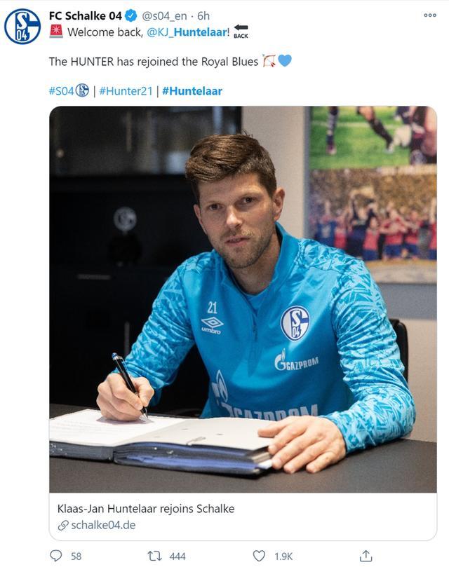 JRS直播网1月20日讯 今天凌晨,沙尔克04官宣签下37岁荷兰锋线老将亨特拉尔,球员将身披21号球衣,双方签约半个赛季。