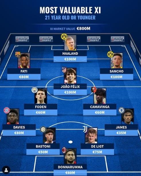 JRS直播网1月11日讯 北京1月11日,《德国转会市场》最新统计出21岁以下球员最贵阵容,其中哈兰德、桑乔、菲利克斯三人身价都在1亿欧。