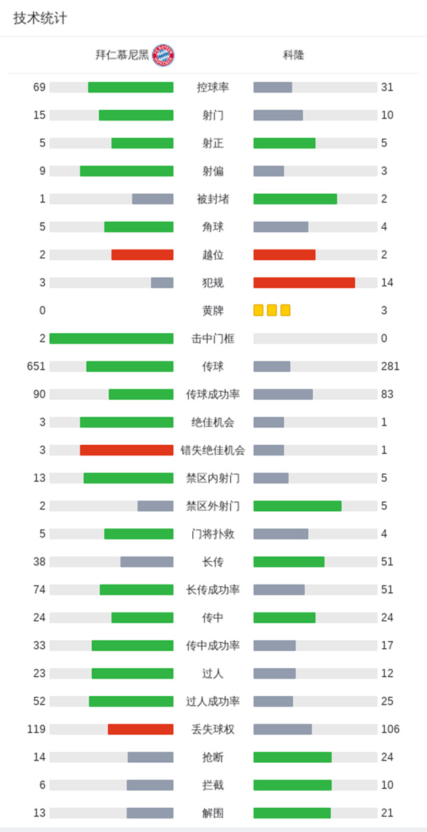 第90+3分钟,科隆后防线停球失误被穆勒断下,穆勒单刀突入禁区冷静推射破门!拜仁2-0科隆