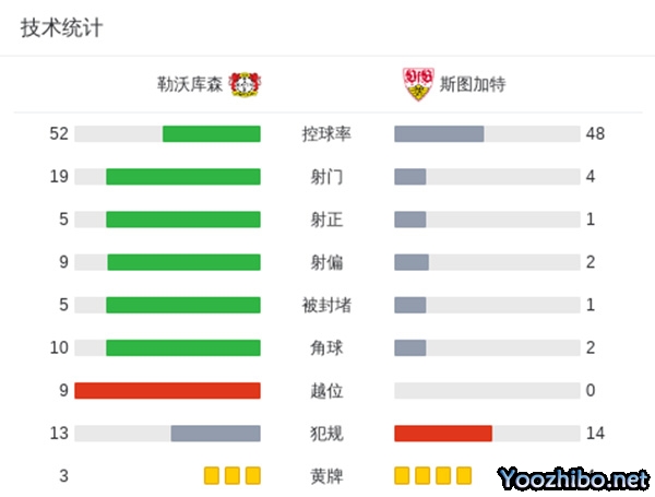 勒沃库森狂轰19脚0-0斯图加特两连平 博尼法斯中柱+失单刀