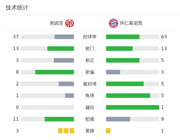 第58分钟,拜仁扩大比分!穆西亚拉前场反抢成功后给到中路弧顶格雷茨卡远射破门,美因茨1-3拜仁。