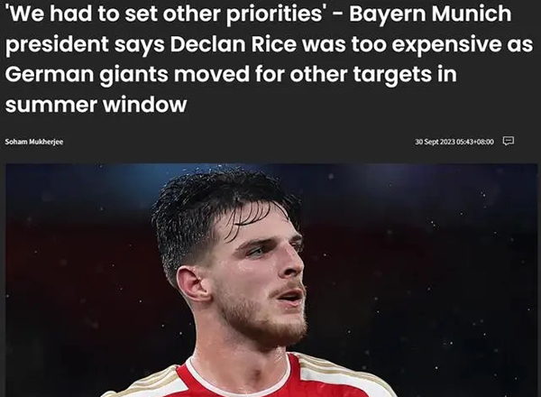 JRS直播网10月01日讯 拜仁慕尼黑主席赫伯特-雷纳表示,德克兰-赖斯的身价对拜仁来说太高了,因此他们在夏天选择了其他目标。