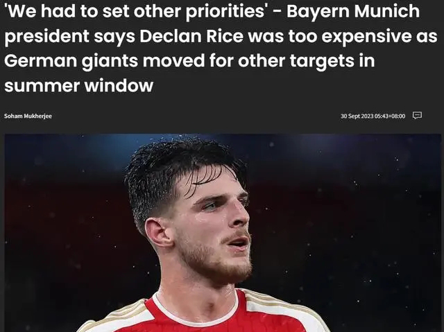 JRS直播网09月30日讯 拜仁慕尼黑主席赫伯特-雷纳表示,德克兰-赖斯的身价对拜仁来说太高了,因此他们在夏天选择了其他目标。