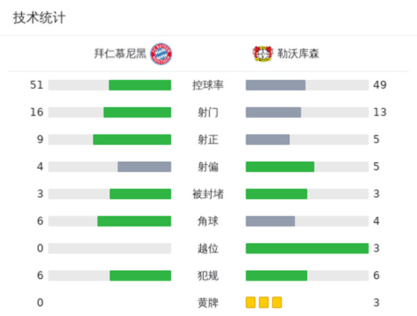 全场比赛结束,拜仁慕尼黑2-2勒沃库森。