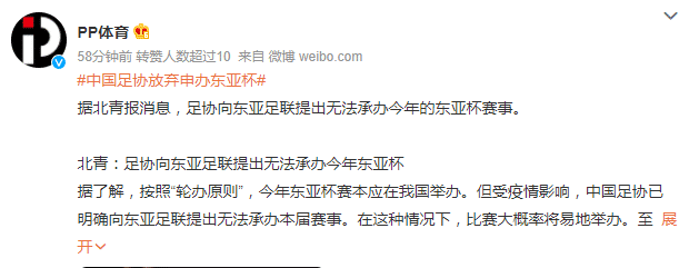 受疫情影响,中国足协已经向东亚足联提出无法承办原定于今年7月举办的东亚杯赛事(东亚四强赛)。按照轮办原则,今年的比赛本来在中国进行。