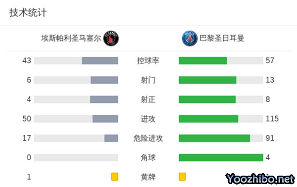 第92分钟,巴黎杀死比赛!主队禁区防守犯规裁判判罚点球,拉莫斯主罚点球破门,埃斯帕利圣马尔塞2-4巴黎。