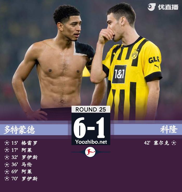 JRS直播网讯 北京时间3月19日凌晨1点30分,2022-23赛季德甲第25轮在伊杜纳信号公园球场展开角逐,多特蒙德坐镇主场迎战科隆。上半场格雷罗两传一射,马伦传射,阿莱和罗伊斯破门,塞尔克扳回一城,下半场阿莱和罗伊斯均梅开二度。最终多特蒙德主场6-1大胜科隆,积分榜方面,多特积53分先赛一轮升至榜首。