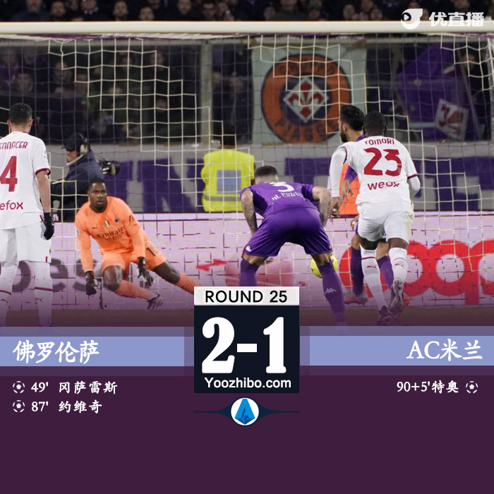 JRS直播网讯 北京时间3月5日凌晨3:45,意甲第25轮,佛罗伦萨对阵AC米兰。上半场,托莫里门线解围,迈尼昂多次扑救力保球门不失;下半场,托莫里送点,冈萨雷斯点射首开纪录,约维奇头球破门扩大比分,补时阶段特奥爆射扳回一球。全场比赛结束,AC米兰1-2佛罗伦萨,四连胜被终结!