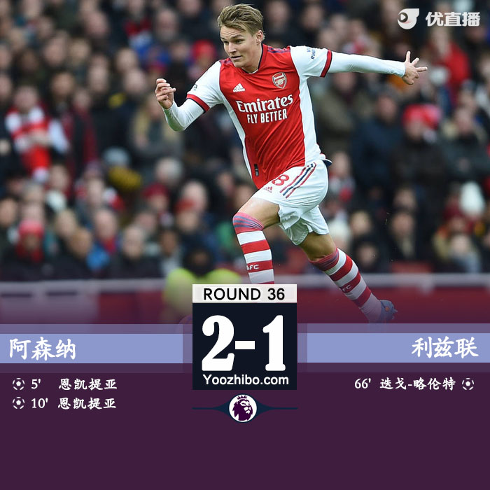 JRS直播网讯5月8日讯 北京时间5月8日21:00,英超第36轮,阿森纳主场对阵利兹联。上半场,恩凯提亚抓住梅斯利耶失误破门,他随后接马丁内利传中再下一城,艾林剪刀脚飞铲马丁内利染红;下半场,迭戈-略伦特扳回一城,此后双方均未破门。