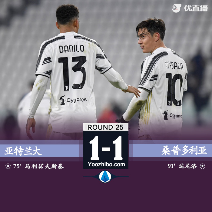 JRS直播网2月14日讯 北京时间2月14日凌晨3:45,2021-22赛季意甲联赛第25轮,尤文图斯客场挑战亚特兰大。上半场两队均无建树,下半场莫拉塔失良机,弗拉霍维奇爆射被斯波蒂耶洛扑出,马利诺夫斯基世界波破门,达尼洛补时绝平,最终尤文图斯1-1战平亚特兰大。