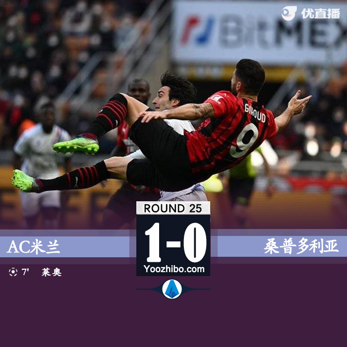 JRS直播网2月13日讯 北京时间2月13日晚19:30,意甲第25轮比赛继续进行,AC米兰对阵桑普多利亚。上半场,迈尼昂助攻莱奥一条龙破门;下半场,双方互有攻守,没有进球产生。最终,AC米兰主场1-0战胜桑普多利亚,迎来联赛两连胜的同时暂时升至积分榜首位。