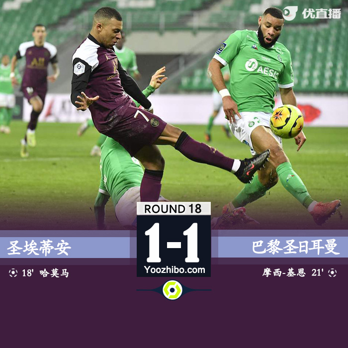 JRS直播网1月7日讯 北京时间1月7日凌晨04:00,法甲第18轮继续进行,巴黎圣日耳曼客场挑战圣埃蒂安。上半场,巴黎后场传球失误,哈默玛帮主队取得领先,基恩迅速扳平。下半场,博安加头球砸中横梁。最终,巴黎圣日耳曼1-1客场打平圣埃蒂安,升至第2位,波切蒂诺上任后的首场比赛没能取胜。