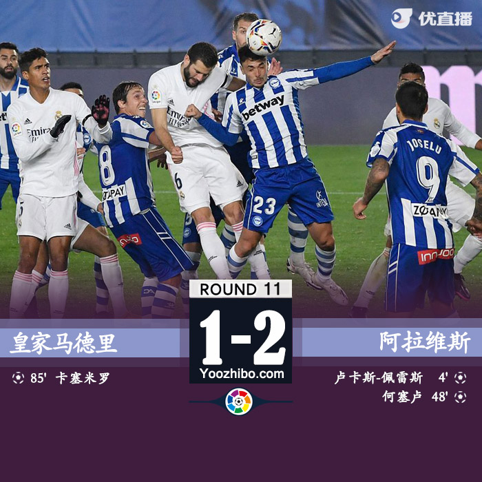 JRS直播网讯:北京时间11月29日04:00(西班牙当地时间28日21:00),2020/21赛季西甲第11轮一场焦点战在迪斯蒂法诺球场展开争夺,皇家马德里主场1比2不敌阿拉维斯,卢卡斯-佩雷斯射入点球,何塞卢抓住库尔图瓦失误破门,卡塞米罗扳回一城。阿扎尔伤退,皇马连续3轮不胜。