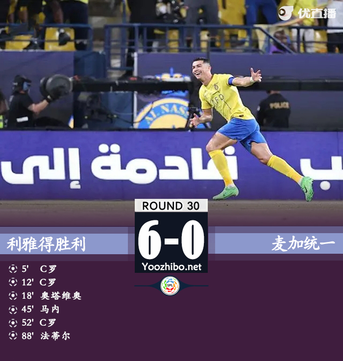 JRS直播网讯:北京时间5月5日凌晨2时,沙特联第30轮,利雅得胜利主场对阵麦加统一。上半场,C罗八分钟内连入两球上演梅开二度,马内助攻奥塔维奥破门扩大比分优势,尾声阶段,奥塔维奥助攻马内再入一球。半场战罢,利雅得胜利暂4-0麦加统一;下半场,马内助攻C罗再入一球完成帽子戏法,法蒂尔最后时刻补射破门。全场比赛结束,利雅得胜利6-0麦加统一!