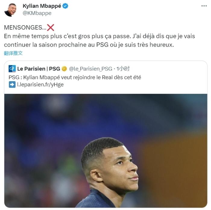 不过姆巴佩本人第一时间转发该报道,并且辟谣道:“谎言。同时,谎言越大越容易被人接受。我已经说过了,下赛季我会继续留在巴黎圣日耳曼,我很开心。”