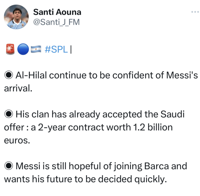 JRS直播网讯06月05日在大巴黎官宣梅西合同到期自由身离队后,阿根廷球王下一站去哪,无疑是全世界球迷关注的焦点,而实际上关于梅西的竞购战早已经悄悄打响。北京时间6月4日凌晨,来自法国知名记者Santi Aouna的最新消息,尽管梅西还没有决定未来,但利雅得新月俱乐部却对签下他信心十足。