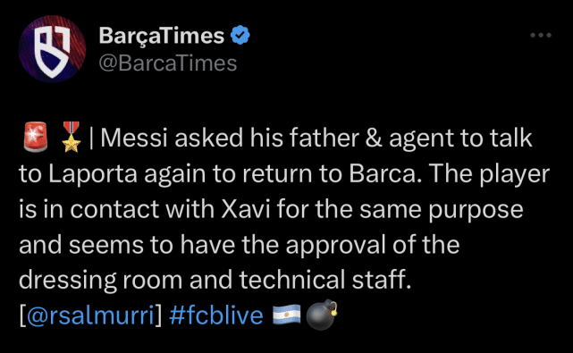 众所周知,梅西与大巴黎的合同今夏到期,但因为遭到大巴黎球迷的嘘声,再加上再度冲击欧冠冠军未果,梅西现在已经倾向于拒绝大巴黎开出的续约合同,然后时隔2年再次回到心心念念的诺坎普球场踢球。而巴萨方面尽管没有公开声明希望梅西回归,但拉波尔塔等高层和巴萨球员,已经多次暗示想让梅西回归。