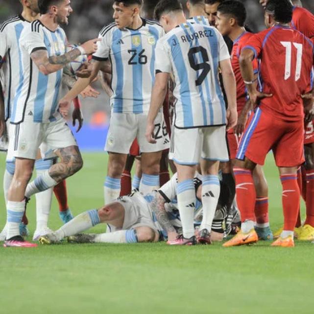 看到自家队长被对手恶意侵犯,阿根廷球员不干了。迪玛利亚、德保罗等人纷纷上前围住肇事者讨要说法。阿根廷球员愤怒也情有可原,这场比赛只是致敬阿根廷世界杯夺冠的友谊赛,巴拿马球员如此粗暴动作,确实太过火。