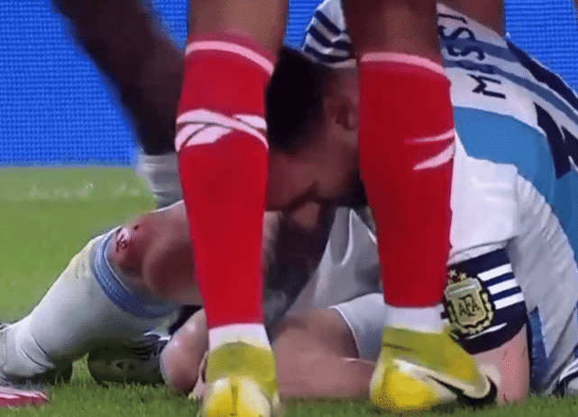 最终,梅西不仅被绊倒,膝盖还被巴拿马球员的鞋钉刮到流血。阿根廷球王疼得龇牙咧嘴,捂着膝盖长时间倒地不起。巴拿马球员加尔万,也因此吃到黄牌。