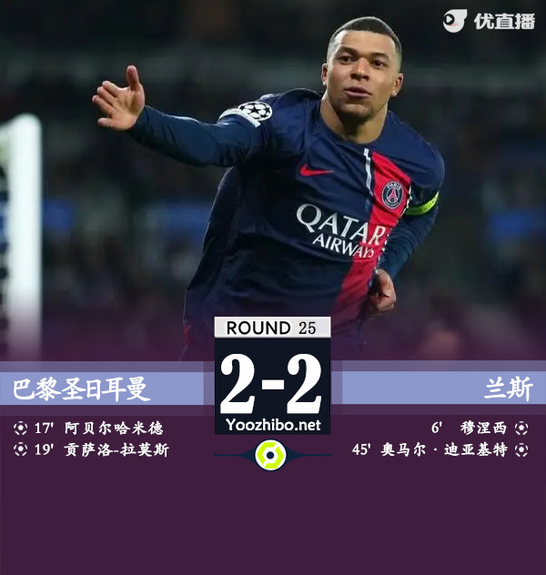 JRS直播网讯 北京时间3月10日法甲 联赛 第25轮,巴黎圣日耳曼主场对阵兰斯。上半场阿什拉夫禁区内玩火被抢断,穆内西破门,之后巴黎角球机会,拉莫斯造阿卜杜勒哈米德自摆乌龙,随后贡萨洛-拉莫斯禁区内折射破门闪电反超,半场尾声巴黎后防被打穿,迪亚基特单刀推射扳平。下半场第73分钟姆巴佩替补登场,上场后姆巴佩共三次射门,两次打正。最终巴黎2-2战平兰斯。