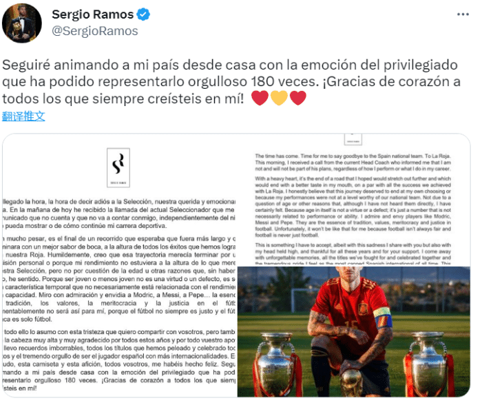 今年36岁的拉莫斯代表西班牙国家队出场180次,打进23求,帮助西班牙队夺得2次欧洲杯冠军和1次世界杯冠军。