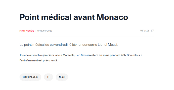 JRS直播网讯02月11日巴黎圣日耳曼俱乐部官方发布有关梅西伤情公告,梅西因腿筋受伤,将缺席对阵摩纳哥比赛,下周一重返训练。