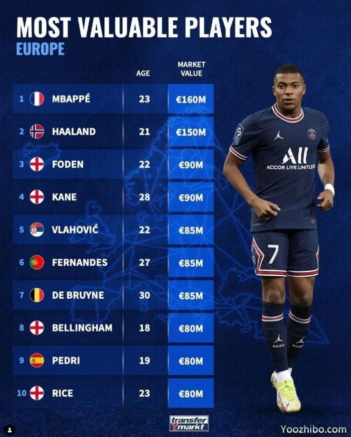 JRS直播网06月27日讯 德国转会市场更新了欧洲球员身价排行,姆巴佩1.6亿欧元领跑,哈兰德1.5亿欧元第二,大幅领先其他球员。