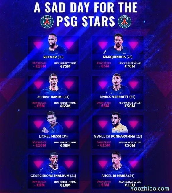 JRS直播网05月31日讯 德国转会市场今天更新了巴黎全队身价,一线队有八名球员身价下跌,梅西身价现在已跌至5000万欧元。