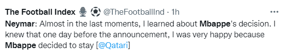 内马尔说道:“我之前经常会和姆巴佩聊天,但我之前确实不知道他的决定。我是在官宣前一天才知道的,我对于他留下的消息特别开心。”