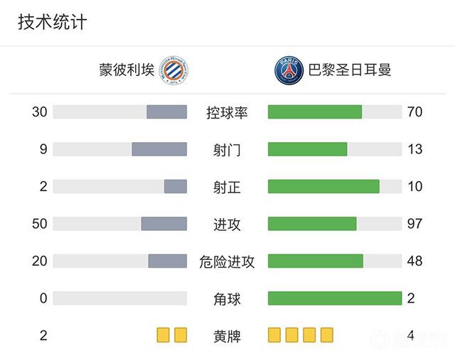 全场比赛结束,巴黎圣日耳曼4-0蒙彼利埃。